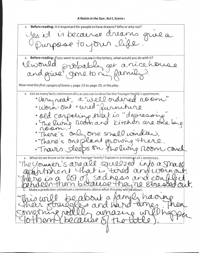 This assignment could be stronger if it required students to engage in a more rigorous analysis. The questions could prompt students to demonstrate understanding of the first scene’s characterization of the Younger family, as well as the themes and symbols it introduces.