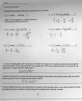 This assignment is structured in such a way that students can complete it procedurally by following a pattern rather than truly demonstrating understanding of the concept of multiplication as scaling: most of the problems follow the same fill-in-the-blank structure as the example in problem #1, so students only have to identify whether one of the factors is a fraction or a whole number and then write “less than” or “greater than” in the corresponding blank.