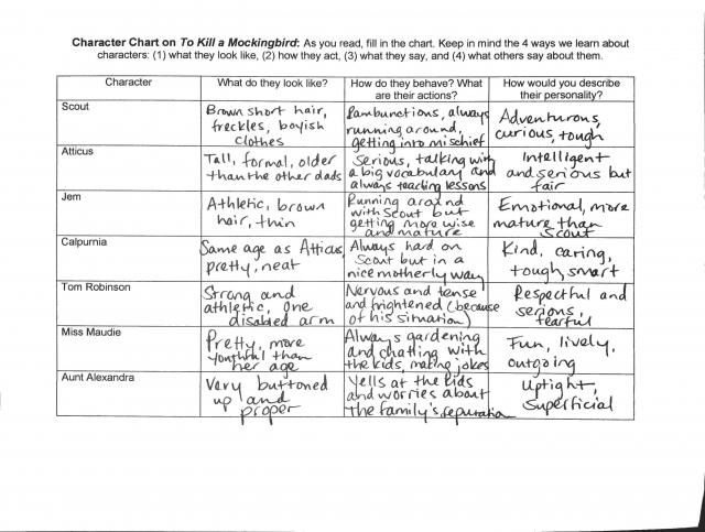 Seventh-grade students read "To Kill a Mockingbird" by Harper Lee, then fill out a chart that describes the salient traits of the main characters. The assignment exposes students to a worthwhile text, but the accompanying task does not reflect the depth of the seventh-grade standards. Students do not have opportunity to write substantively. Instead, they jot a series of descriptive words and phrases about multiple characters. There is no expectation that they include specific details from the text to support their descriptions.