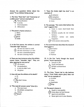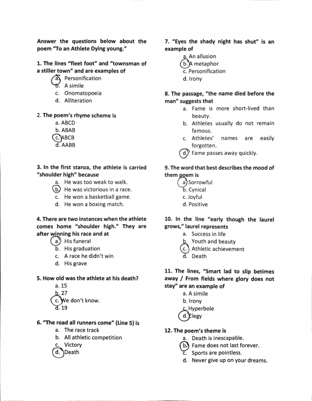 Eighth-grade students read “To an Athlete Dying Young” by A.E. Housman, then respond to a series of multiple-choice questions. While the text is grade-appropriate and worthwhile, the questions only ask students to recall straightforward content from the text (e.g., “How old was the athlete when he died?”) or to identify discrete examples of literary devices (e.g., “’Eyes the shady night has shut’ is an example of _______”). The questions do not build deep understanding of the text, and there is no expectation that students draw on specific details and language to support their responses.