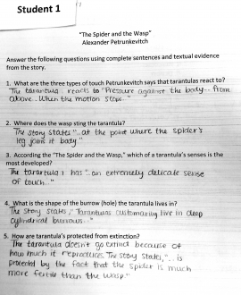 Ninth-grade students read a renowned scientific article called “The Spider and the Wasp,” by Alexander Petrunkevitch and respond to questions about it. Although the text is strong, the questions only ask students to restate basic facts from the text and don’t ask them to draw on specific details and evidence.