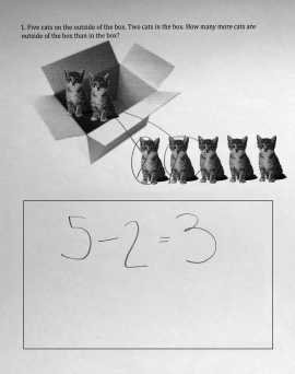 Kindergarten students complete two addition and subtraction word problems about cats. This assignment gives students a chance to model real-world situations mathematically, but only one of the two problems is well-aligned with a kindergarten standard.