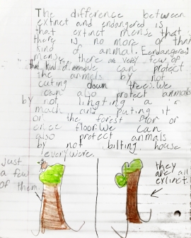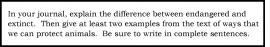 First-grade students listen to an adequately complex text, then write and draw in response to a prompt about a key idea. This assignment exposes students to a worthwhile text about the impact of habitat changes on animals. It poses a question that requires students to focus on important details in the text, and allows them to share what they learned through writing.