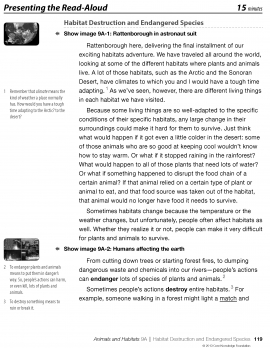 It allows students to listen to an engaging and worthwhile text, read aloud by a fluent reader. The text builds students’ knowledge about what happens to living things when their habitats change and offers complex vocabulary and vibrant illustrations.