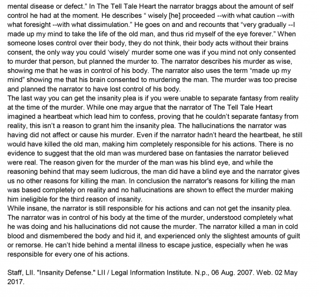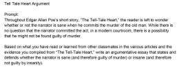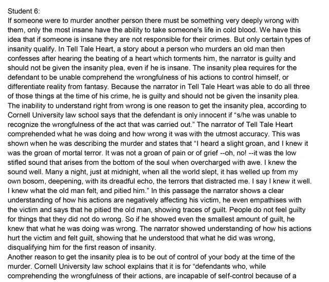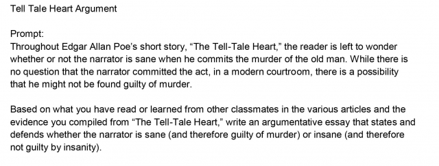 Seventh-grade students read “The Tell-Tale Heart” by Edgar Allen Poe, a grade-appropriate text, as well as supplemental non-fiction texts about the legal concept of insanity. They then write an argumentative essay about whether the narrator of “The Tell-Tale Heart” is sane (and therefore guilty) or insane (and therefore not guilty) of the story’s crime. This assignment exposes students to a noteworthy literary text and content-rich non-fiction texts, and asks students to write a substantive analytical essay using evidence from both.
