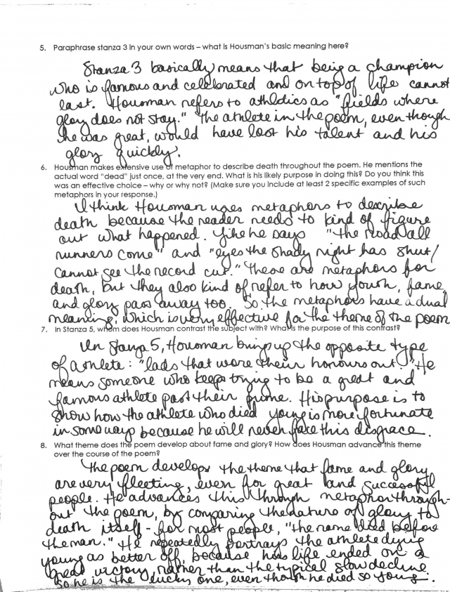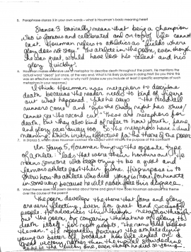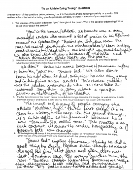 Eighth-grade students read “To an Athlete Dying Young,” a poem by A.E. Housman. The text is grade-appropriate and worthwhile, and introduces students to complex literary elements, such as the use of imagery and metaphor. The questions are purposefully sequenced to build students’ understanding, beginning with basic comprehension (e.g., “Who is the speaker addressing? What do we know about this person?”) and moving ultimately to deeper meaning (“What theme does the poem develop about fame and glory?”). Students are expected to support their responses with evidence from the text.