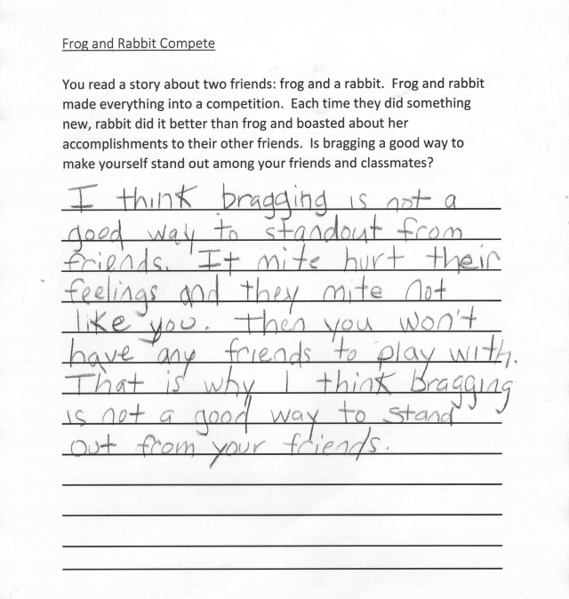 First-grade students read a story, then respond to a prompt in writing. The text, which is about a frog and a rabbit in competition, is not adequately complex or worthwhile, and the writing prompt is not text-dependent. While the task references a story, it does not require students to read carefully and answer a question based on the text.