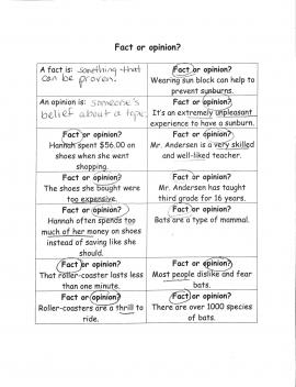Third-grade students define the terms “fact” and “opinion” and then determine which term applies to a series of statements. This assignment does not require students to read and make meaning from a worthwhile text.