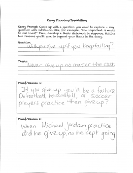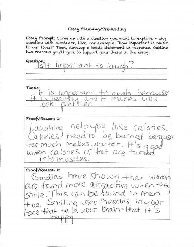 Seventh-grade students plan an essay on a topic of their choice, then pose a question, write a thesis statement, and outline a rationale to support that thesis in an essay. (For example: “Is it important to laugh?” “It is important to laugh because it is healthy and makes you look pretty.”) This task is not connected to any text. Instead, the outline and essay are based solely on personal opinions. There is no opportunity to read, build knowledge, draw on evidence from texts, or share learning.