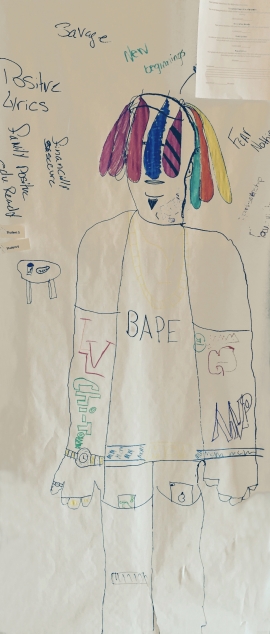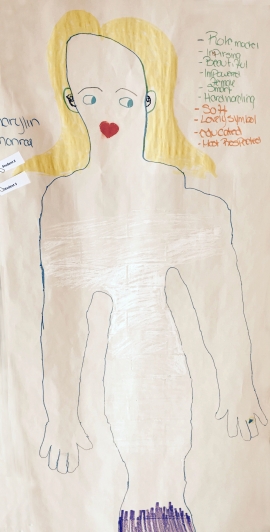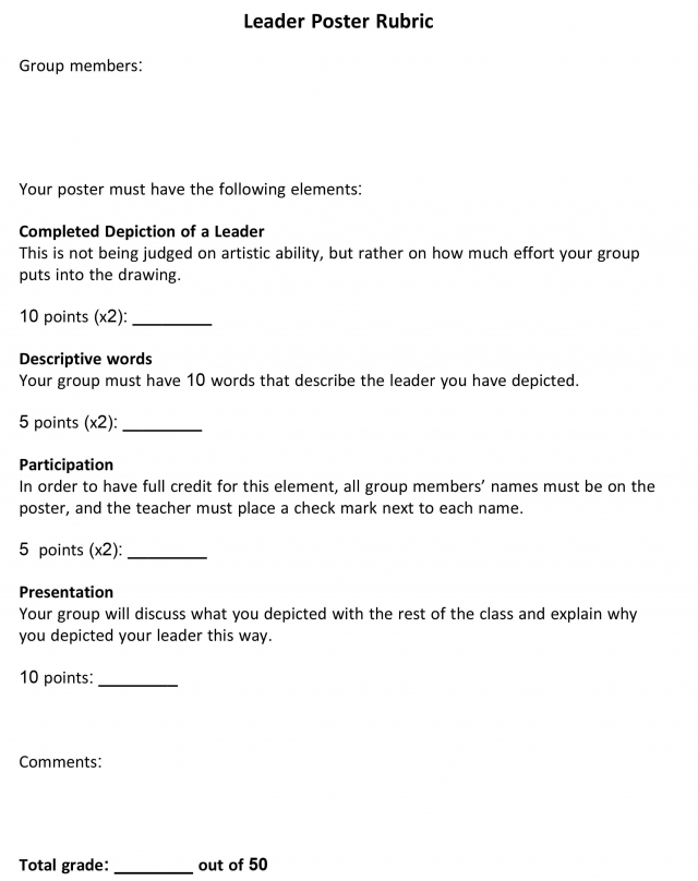 Ninth-grade students work in small groups to create a poster about what makes an effective leader. The poster includes a picture and some descriptive words for a leader, which groups of students present to the class. There is no associated text, so students create this poster based on their personal experiences and opinions rather than grounding their work in information learned from reading.